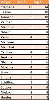 I'm going to redo the players I did before, because with the guys above I leaned more heavily on VORP, while I didn't consult VORP at all earlier. It shouldn't change the results too much, but I'm also going to add in the Big 5 of Clemens, Pedro, Maddux, Glavine, and Johnson, just for consistency's sake (and because I'm bored). I'll also do a chart compiling the top 5/10 finishes of all the players.