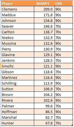 Yes, and take a look at those names. The bottom 5 pitchers in the top 10 pitchers of the 90s weren't anywhere near as impressive as that bottom five. With the exception of probably Catfish Hunter and Juan Marichal, you're looking at 8 pitchers who are better than all but the top 3 pitchers of the 90s.