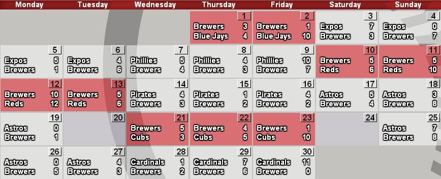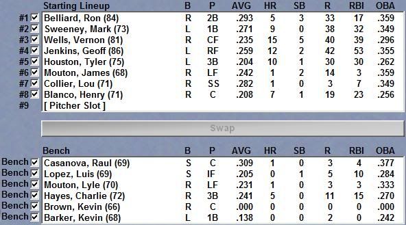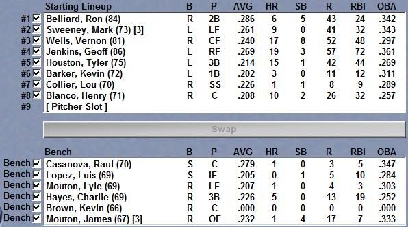 Recap: June was our worst month yet. We managed only a 9-19 record, largely because of how our offensive production plummeted after trading shortstop Jose Hernandez and center fielder Marquis Grissom. The miserable 9-19 record is also likely simply of the team regressing to its talent level, or lack thereof, as well. There were a few bright spots in June, however, most notably Ben Sheets. Sheets was 2-1 with a 2.78 ERA, 25 K's, 8 walks, a BAA of .215 in 39 innings pitched. Sheets went eight or more innings in four of his five June starts, including a complete game shutout over the Astros on the 26th, and walked no more than two batters in any of those five starts. Wells also a dip in his batting average, but nearly doubled his homerun total in a single month. I knew this poor performance was coming, and I don't expect it to stop anytime soon.