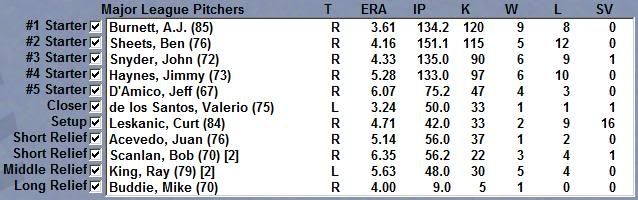 Recap: Just when I thought things couldn't get any worse, July came along. This team can really pitch, and it should only get better as the kiddies get experience and mature, with our two aces, Sheets and Burnett, both under the age of 25 and leading the staff already, but the offense is embarrassing. Belliard and Jenkins are both getting to the age where they've already establish what they're going to be, and though they're both solid major league contributors neither are, or will become, superstars. Vernon Wells has shown a lot of promise, including a game that he went 5-7 in and fell just a homer shy of the cycle, but hes gonna need help. The good news, however, is that David Wright has been raking in A ball and may be ready very soon, despite being only 17. Hes hitting .433/.530/.763 with the Brevard County Manatees, as well as blasting seven homers, knocking home 29 runs, and scoring 27 of his own, and in just 97 AB's and 26 games. It is become clear that we made an excellent pick with him and that he is indeed the future of this team, and the future is bright. He's one of the few positional prospects we have though, so we may dip into Free Agency this year and go after a big fish like Alex Rodriguez, since we're 22 million dollars under our budget.