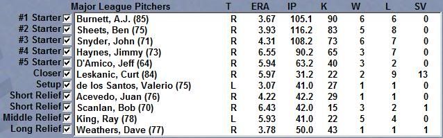 HTML Code:Player Name Team Starts W L ERA IP SV CG K K/9 BB BB/9 H H/9 OBA OOBA OSA Sheets, Ben MIL 17 5 8 3.93 116.2 0 2 83 6.40 30 2.31 111 8.56 .241 .299 .398 Burnett, A.J. MIL 17 6 6 3.67 105.1 0 1 90 7.69 45 3.84 99 8.46 .242 .322 .364 Snyder, John MIL 18 6 7 4.31 108.2 0 0 73 6.05 58 4.80 130 10.77 .290 .381 .406 Haynes, Jimmy MIL 16 3 7 6.55 90.2 0 0 65 6.45 58 5.76 107 10.62 .292 .390 .490 D'Amico, Jeff MIL 10 3 2 5.94 63.2 0 0 40 5.65 22 3.11 76 10.74 .287 .351 .475 Weathers, Dave MIL 1 1 1 3.78 50.0 1 0 43 7.74 25 4.50 55 9.90 .281 .362 .383 Acevedo, Juan MIL 0 1 1 4.22 42.2 0 0 29 6.12 14 2.95 43 9.07 .269 .328 .425 Leskanic, Curt MIL 0 2 9 5.97 31.2 13 0 22 6.25 20 5.68 36 10.23 .281 .378 .375 King, Ray MIL 0 5 4 5.93 41.0 0 0 22 4.83 23 5.05 45 9.88 .271 .363 .470 Scanlan, Bob MIL 2 3 2 6.43 42.0 1 0 15 3.21 16 3.43 55 11.79 .318 .379 .497 de los Santos, Valerio MIL 0 1 1 3.07 41.0 0 0 27 5.93 23 5.05 36 7.90 .234 .337 .325