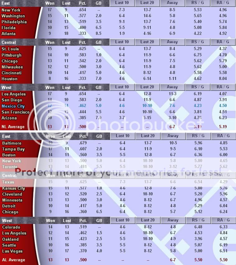 The pitching and defense are still doing a great job keeping runs off of the board.Code:2013 Pitching Team IP ERA G GS W L SV K BB R/9 Snell, Ian MEX 41.0 3.51 6 6 2 4 0 41 12 9.88 Adenhart, Nick MEX 37.0 2.68 5 5 2 1 0 19 16 10.22 Swarzak, Anthony MEX 32.0 3.38 5 5 2 0 0 25 12 11.81 Castillo, Fabio MEX 31.2 3.98 5 5 2 0 0 29 9 10.52 Hochevar, Luke MEX 26.0 7.27 5 5 2 3 0 18 7 15.92 Marquez, Jeff MEX 14.1 4.40 5 0 0 0 0 7 1 9.42 Pena, Luis MEX 13.0 4.85 10 0 0 2 0 10 8 13.85 Fields, Joshua MEX 11.0 1.64 10 0 0 1 6 12 2 7.36 Zagurski, Mike MEX 11.0 11.45 11 0 1 2 0 14 8 18.00 Luebke, Cory MEX 10.1 0.00 4 0 1 0 0 5 3 7.84 Hernandez, Fernando MEX 5.0 5.40 8 0 0 1 0 3 5 25.20
